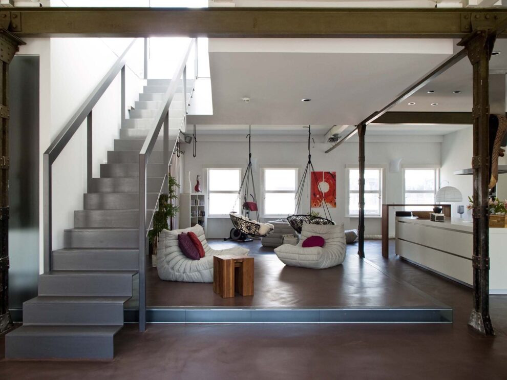 Diese gestalterischen Eingriffe betonen die industrielle Vergangenheit und schaffen gleichzeitig ein zeitgemäßes Wohnambiente.