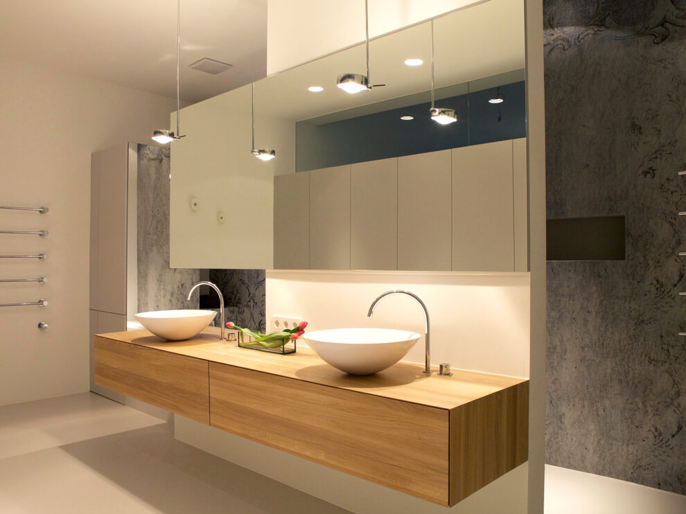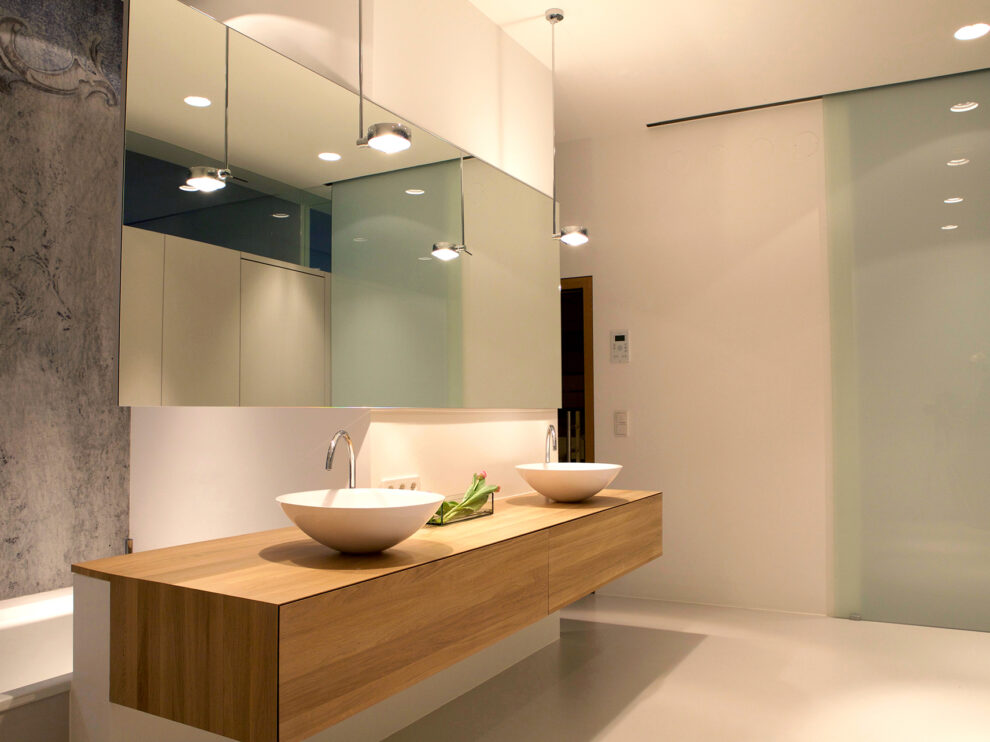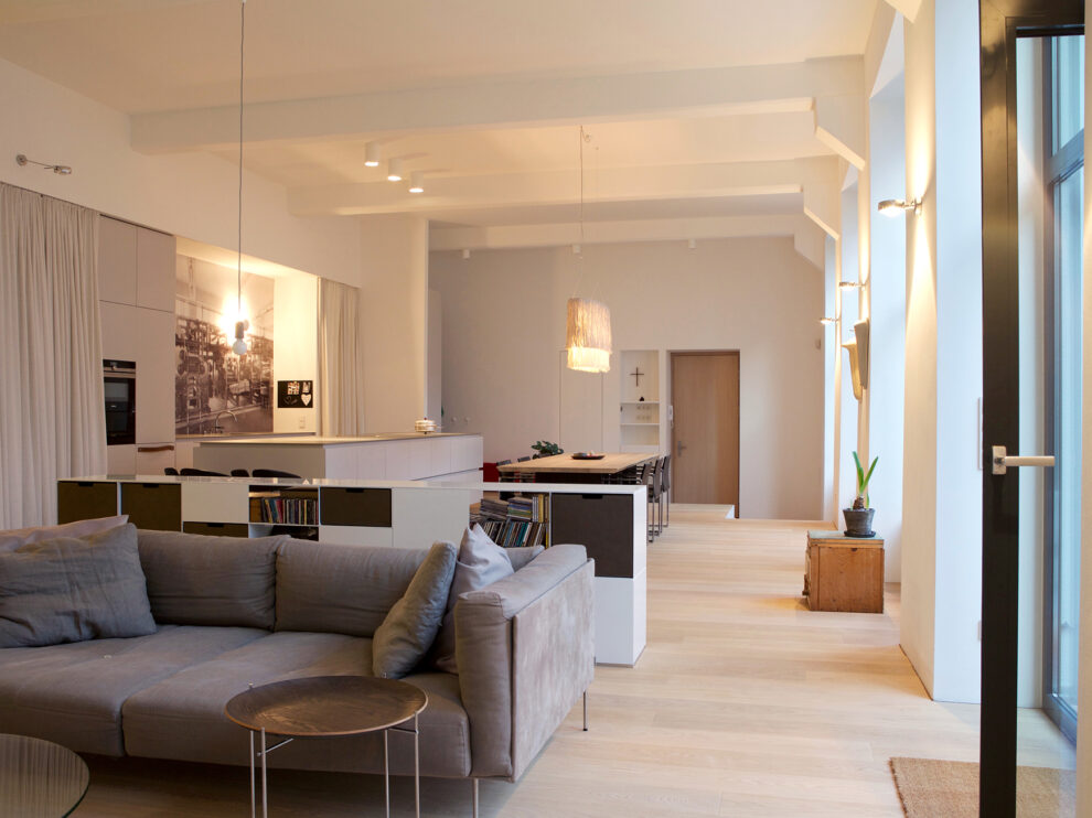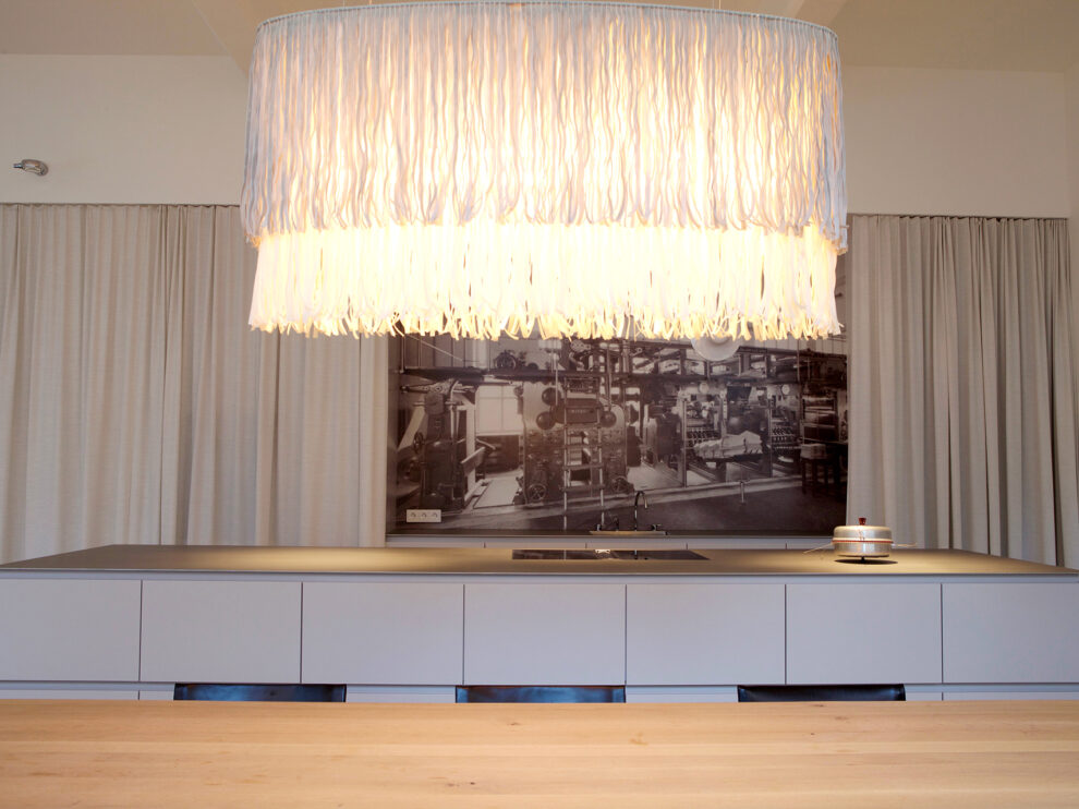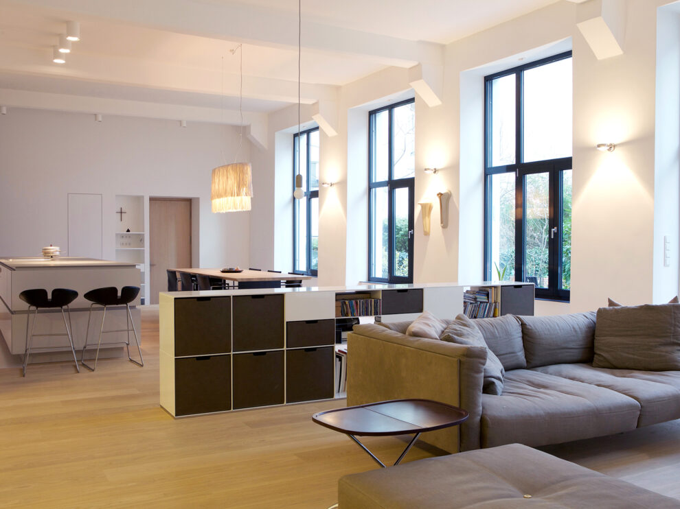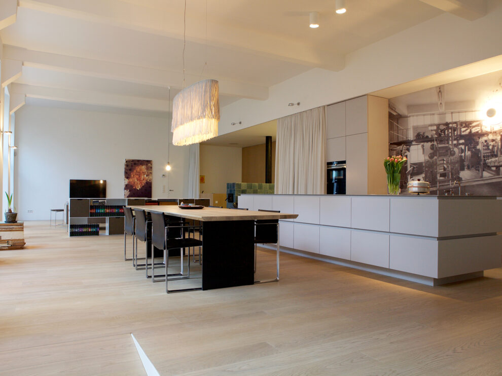 From the late 19th century onwards, these premises were home to the Herold printing house and boasted Vienna’s first rotary printing press. Telephone directories and daily newspapers were printed here until 1992. The production facility was subsequently converted into a loft apartment, the centrepiece being a pillarless space built from reinforced concrete that is 32 metres long with an impressive nine-metre ceiling. The space has a floor area of 288 square metres and receives natural daylight through windows along one side, giving it a special vibe.