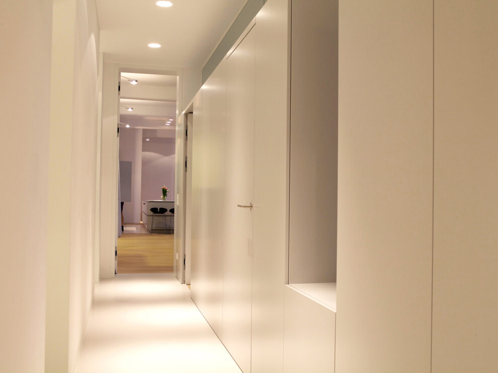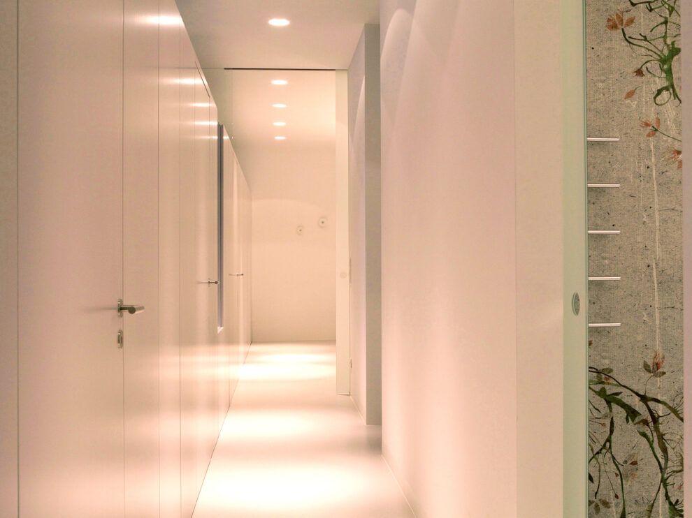 The functional niche-like areas on the darker side balance the proportions of the space. The main living area has a flexible spatial layout, with textile partitions that allow the space to be made smaller or larger depending on individual needs. Side rooms can thus be created or removed at will as required by the users.