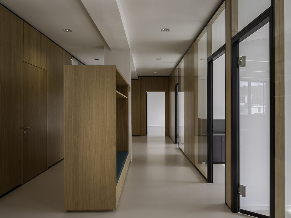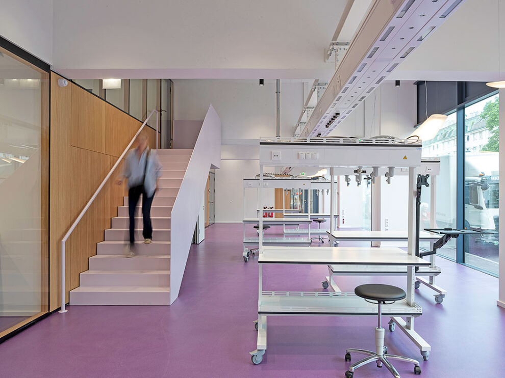 On the ground floor, the facade is broken up by extensive glazed elements that create a link between the interior of the building and the urban space outside. This transparent design allows passers-by to look into the newly-created showroom presenting the latest developments in science and technology.