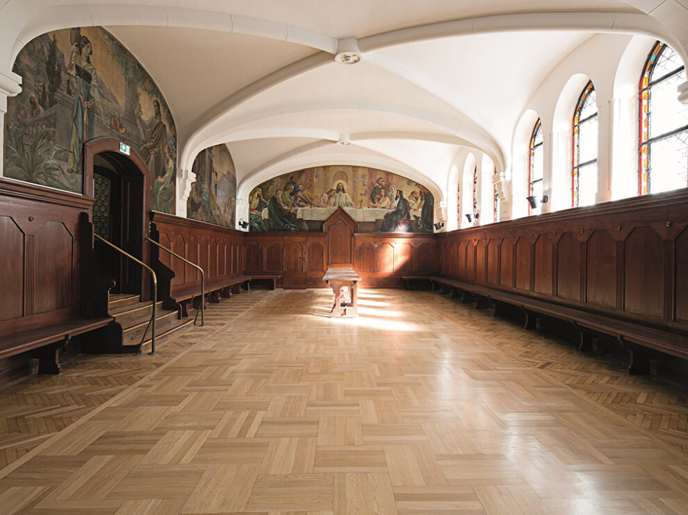 Die Räumlichkeiten, die einst eine Kapelle und ein Refektorium beherbergten, sind revitalisiert worden und dienen jetzt als Bereiche für Studium und sozialen Austausch. Selbst die frühere Großküche hat sich in einen dynamischen Fitnessraum verwandelt und ist zum lebendigen Mittelpunkt für junge Menschen geworden.