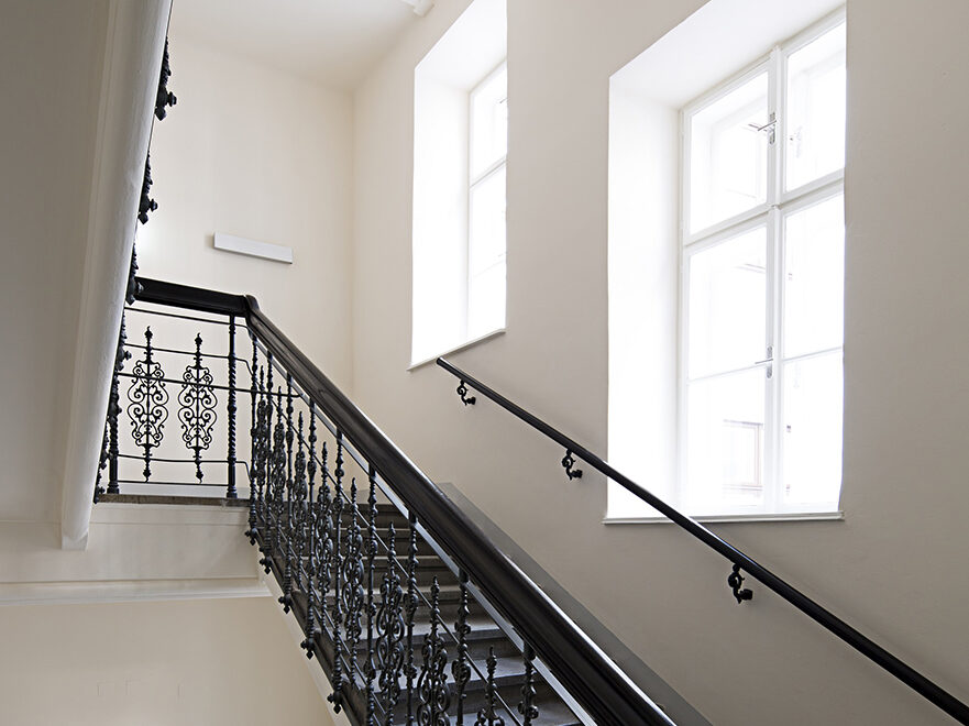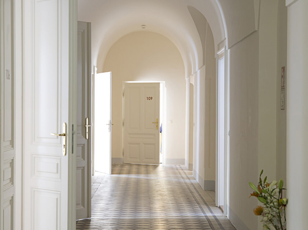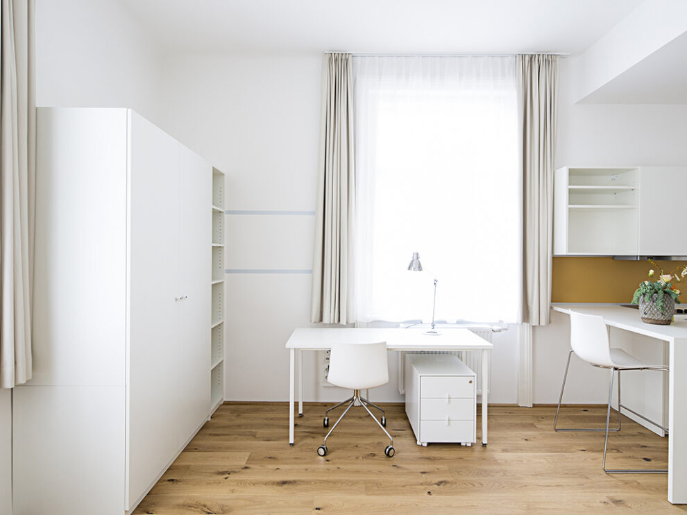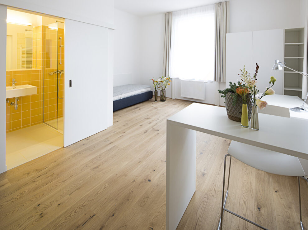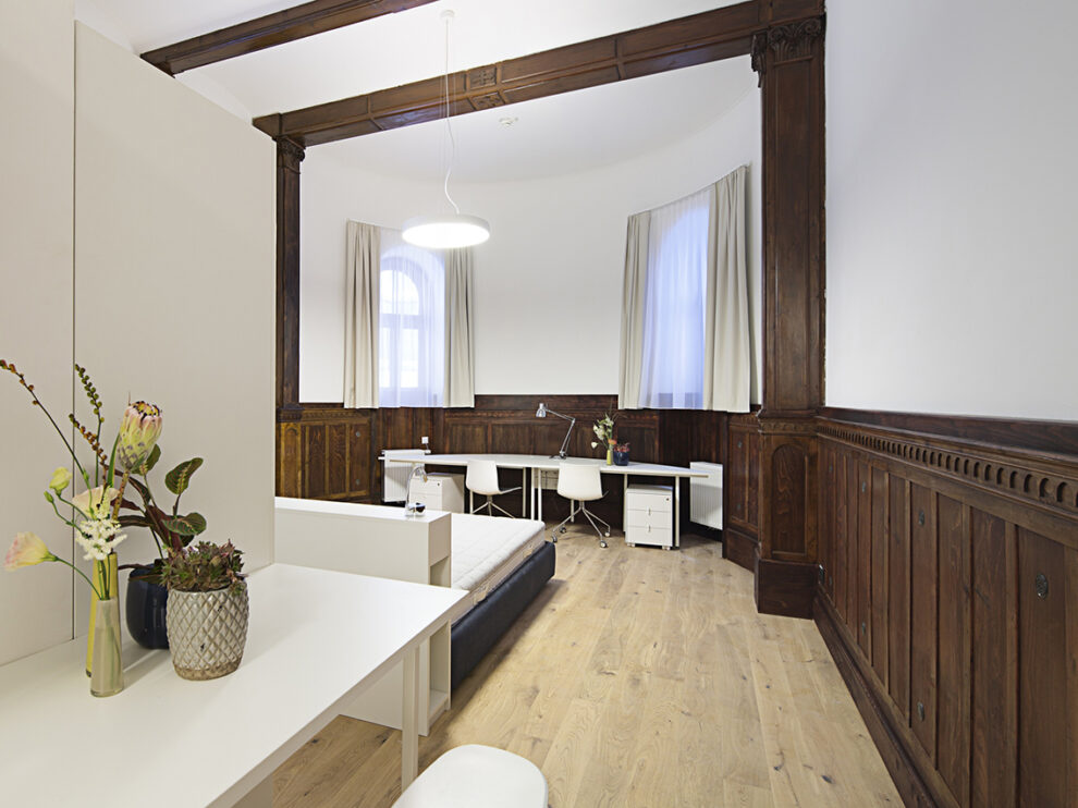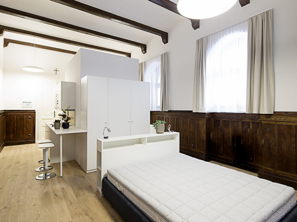 Das historische Gebäude in Wien, errichtet in den frühen 1910er Jahren und ehemals eine Ordensresidenz der Gesellschaft Jesu, hat sich durch eine intelligente Umnutzung und eine fachkundige Restaurierung in ein zeitgemäßes Studentenwohnheim verwandelt. Dabei wurde unter Einhaltung zahlreicher Denkmalschutzbestimmungen das Interieur so gestaltet, dass maximaler privater Wohnraum entsteht: Jedes Zimmer ist nun mit einer eigenen Küchenzeile und sanitären Anlagen ausgestattet.