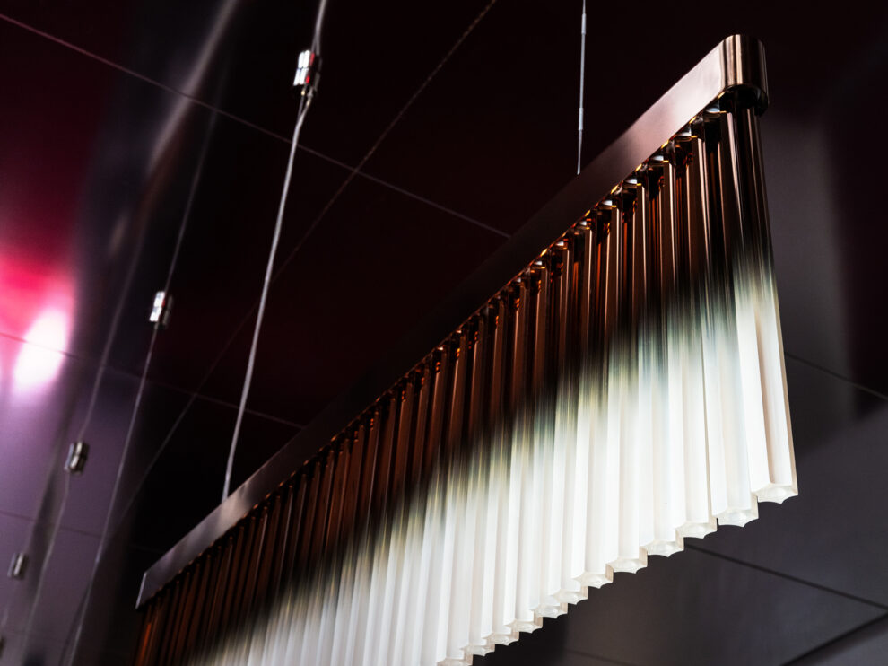 Neue maßgefertigte Luster, die dem Raum zusätzliche Tiefe und Wärme verleihen, sind ein wesentlicher Teil der Entwurfsidee. Licht, Material und Form greifen gezielt ineinander – zurückhaltend, aber mit klarer gestalterischer Haltung.