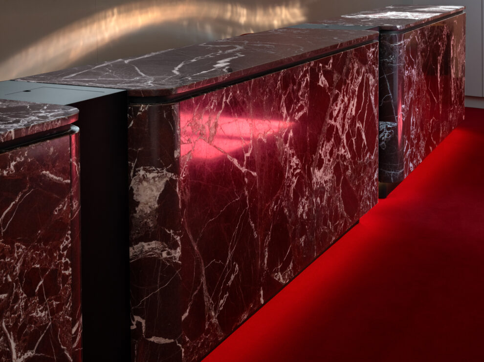 Statt durchgehender Theken prägen nun freistehende, gegliederte Pulte aus dunklem Naturstein und Holz den Raum. Ihre geschwungene Form steht bewusst im Spannungsverhältnis zur runden Fassade des Hauses. Ein zart roséfarbener Hintergrund greift den Ton der bekannten Außenfassade auf und verbindet den Innen- und Außenraum auf elegante Weise.